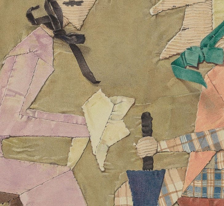 This is not a picture made from bits of fabric appliquéd onto craft paper. This is a watercolor painting of a picture made from bits of fabric appliquéd onto craft paper. It is astounding.