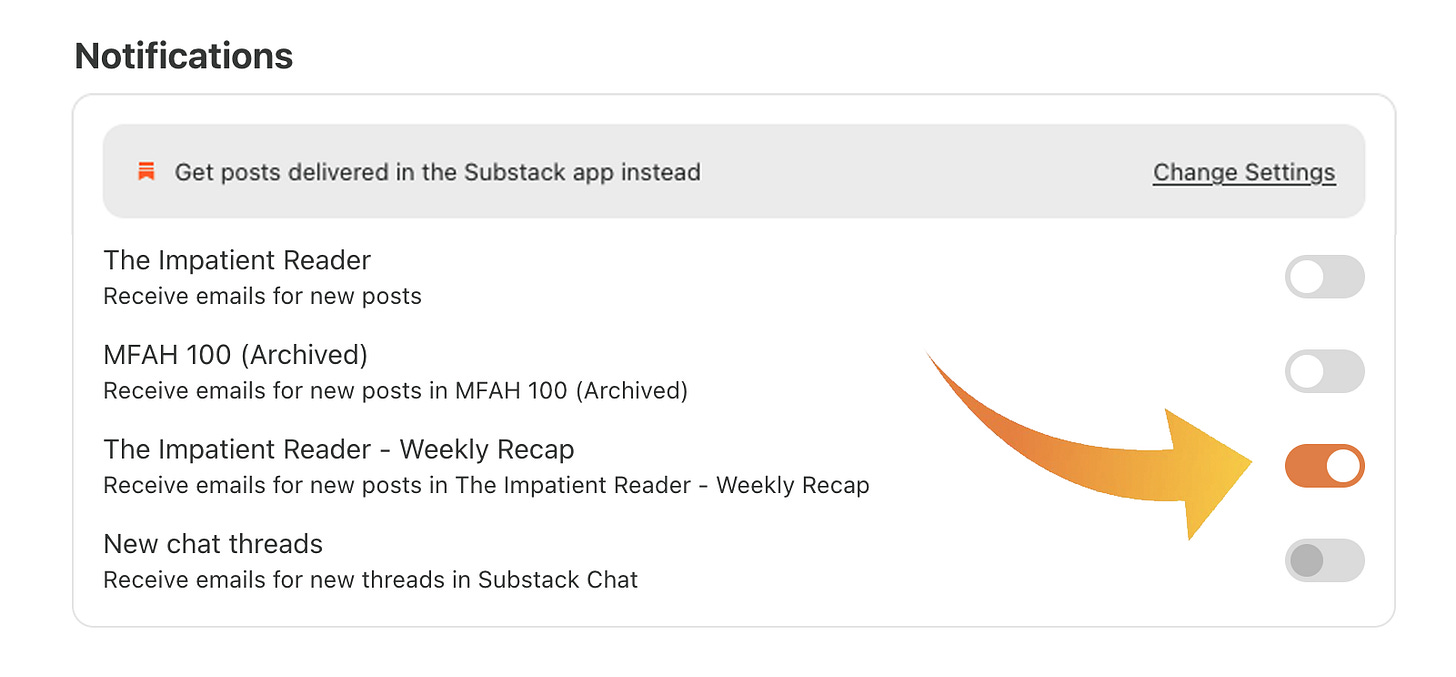 Subscribers will receive an email for each daily post. Maybe that’s something you enjoy with your morning coffee, but you can also opt to receive a weekly summary every Sunday. Click here to manage your subscription. You’ll want to turn on “The Impatient Reader - Weekly Recap” and turn off everything else (see below).