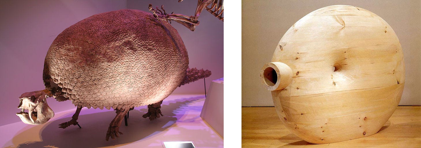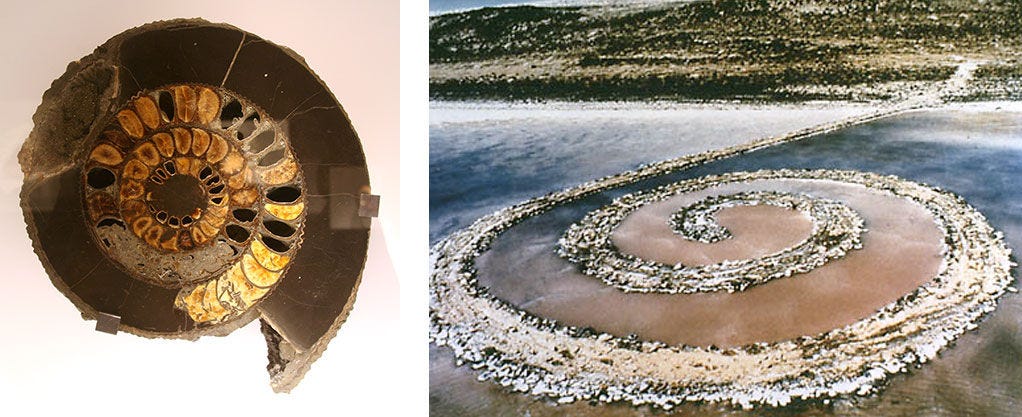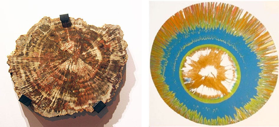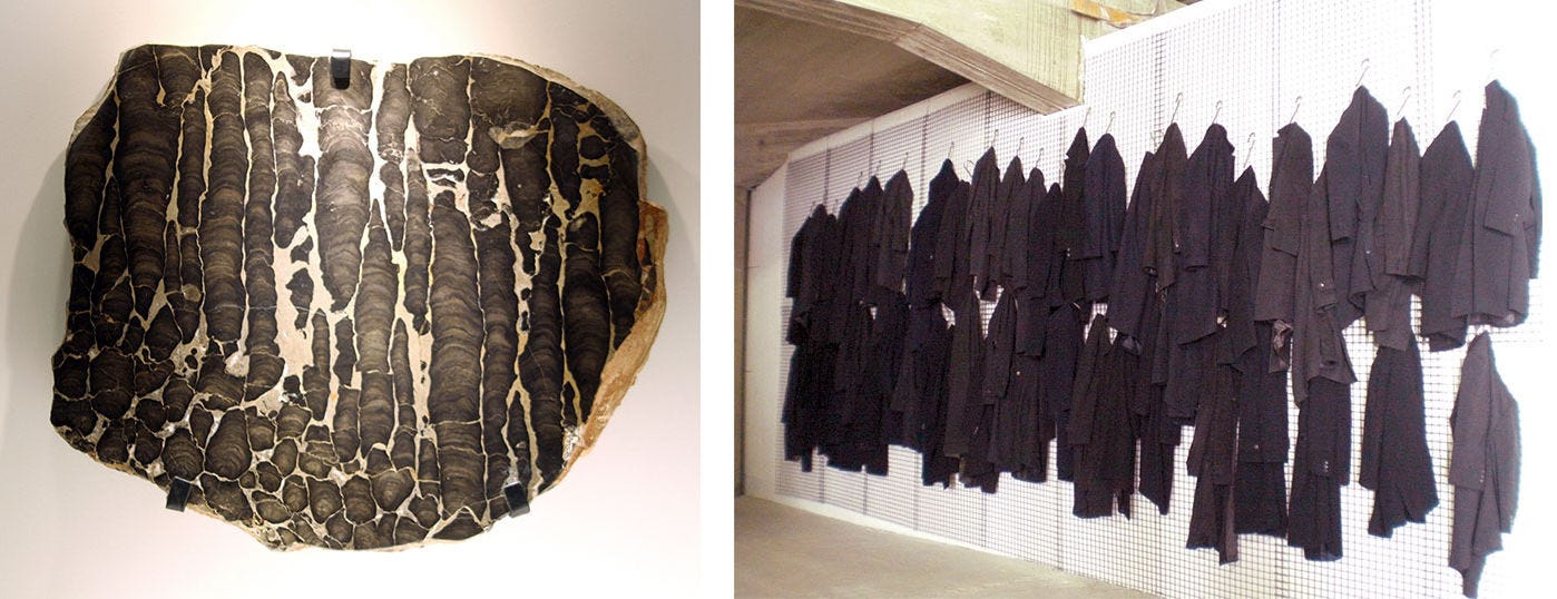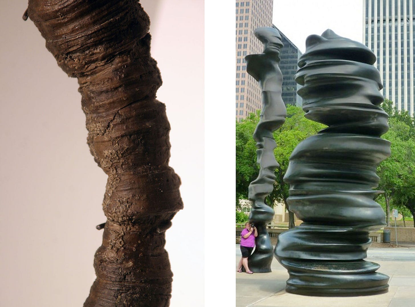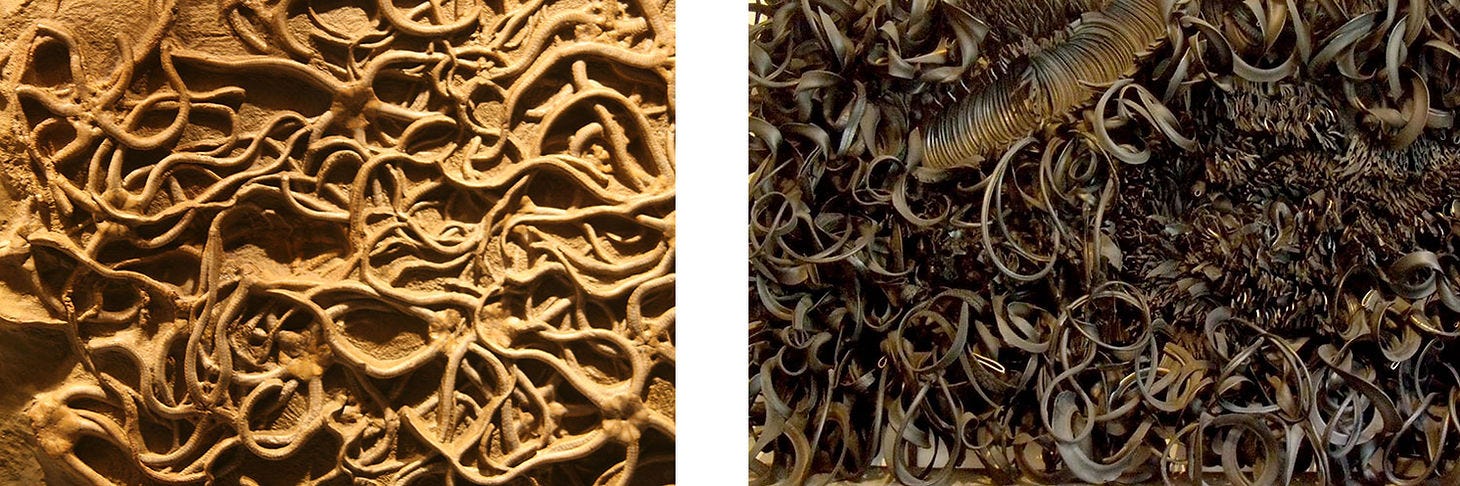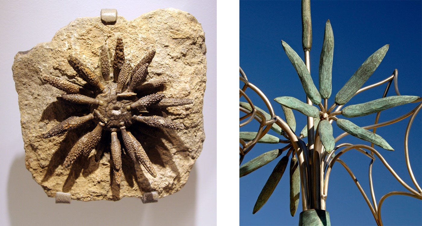 Left: Fossilized coral from the Devonian period, Switzerland. Right: Tony Cragg, In Minds, 2001- 2002