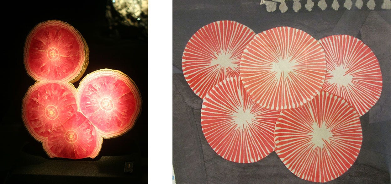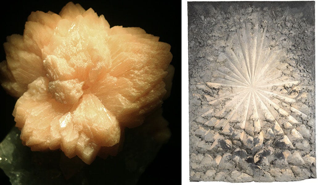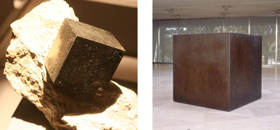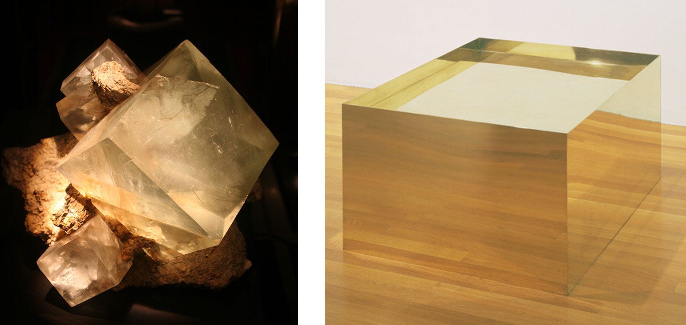 Left: Quartz v. Selenite, Rio Grande de Sul, Brazil. Right: Donald Judd, Untitled (detail), 1974
