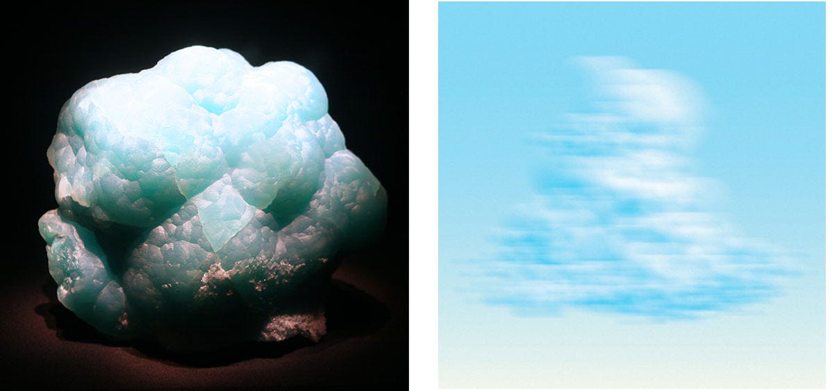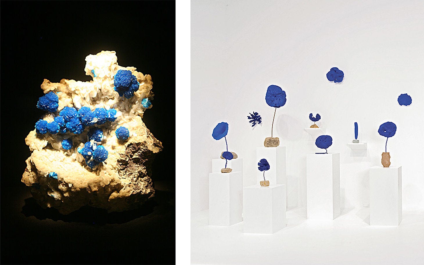 Left: Cavansite, Wagholi Quarry, Maharashtra, India. Right: Yves Klein sponge sculptures