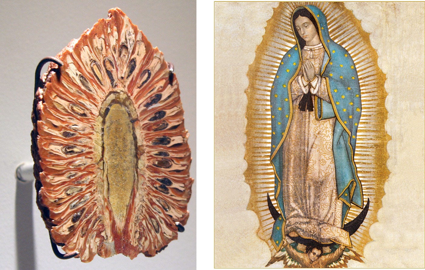 Left: Petrified pine cone, Jurassic period, Argentina. Right: Our Lady of Guadalupe (date unknown)