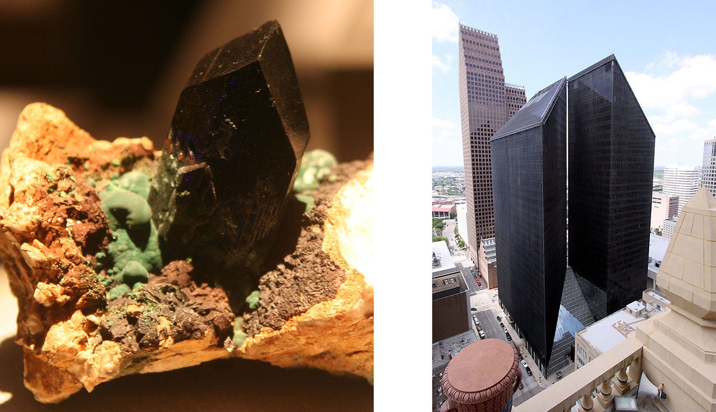 Left: Cerussite, from the Otjikoto Region of Namibia. Right: Pennzoil Place, downtown Houston, designed by Philip Johnson and John Burgee, 1975