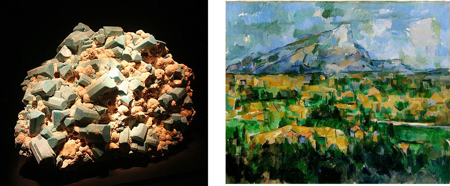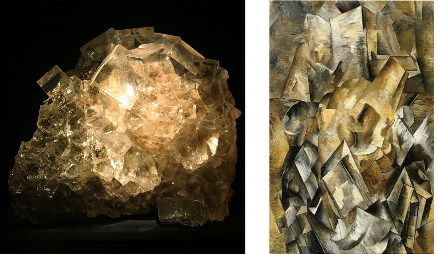 Left: Elbaite & Quartz, Tourmaline Queen Mine, San Diego County, California. Right: Georges Braque, Still Life with Mandola and Metronome, 1909