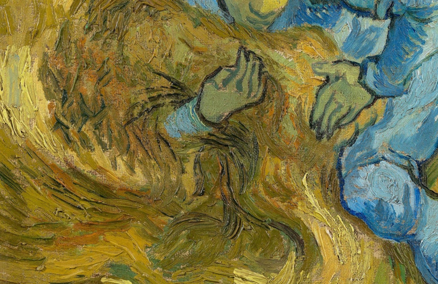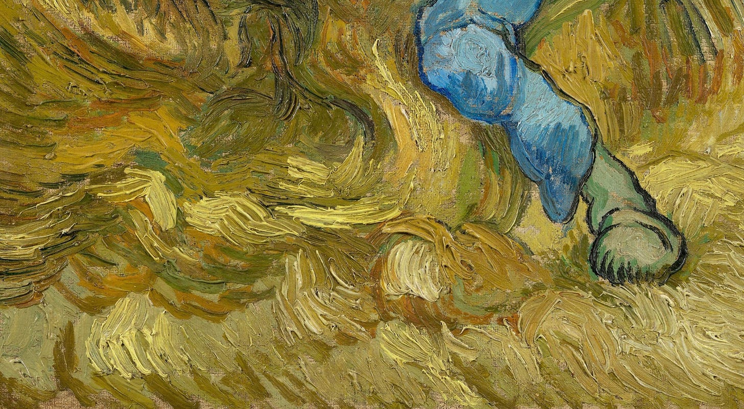 The figure in The Sheaf-Binder (1889) exists in a roiling field of matter, the shape of his body echoed by the shape of his surroundings. There is so much fluidity in the image—the figure himself, trying to gather it all up in his arms, his pose almost like a modern dancer, and these swirling mounds of—something—surrounding him, their liquid movement like bubbling stew or the surface of the ocean.